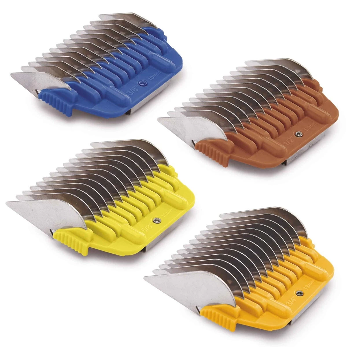 AGS® WIDE Snap On Combs allow you to get the coat down to a specific length so no need to spend hours scissoring. Attachment combs are a huge time saver because you won’t need to use your scissors as often. They are designed to soften the coat with their longer teeth and can offer an even and proportionate cut all over. Also ideal for leaving more hair on the dog’s body. Metal combs are precision made, and extremely durable. Combs attach to any AGS #30 wide, #30WSE, #15 wide, or #10WF blade. Each comb is color coded to a size for easy identification.