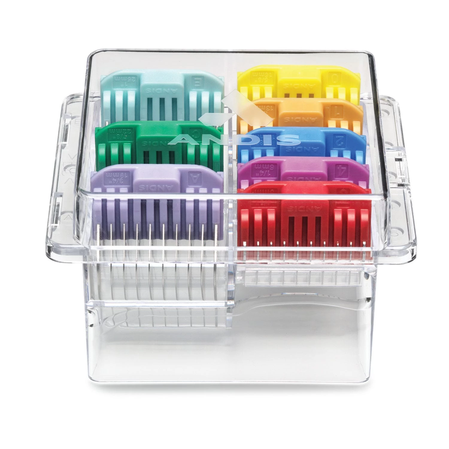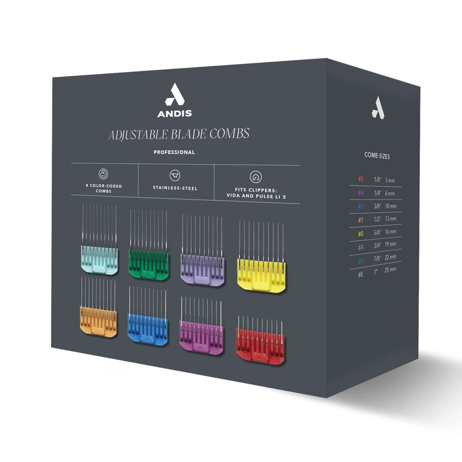 Enhance all of your creative options with this eight-piece, color-coded attachment comb set. Sculpt creative coifs and velvety smooth top-line blends for any pooch with these high-quality stainless-steel combs that easily attach to your Vida® or Pulse Li 5 clipper. Designed to fit Andis Vida (Item AD8579 43) and Li5 model (Item AD7315 79) clippers and 5 in 1 blades. Includes 8 Stainless steel blade combs in sizes 1/8″ to 1″.