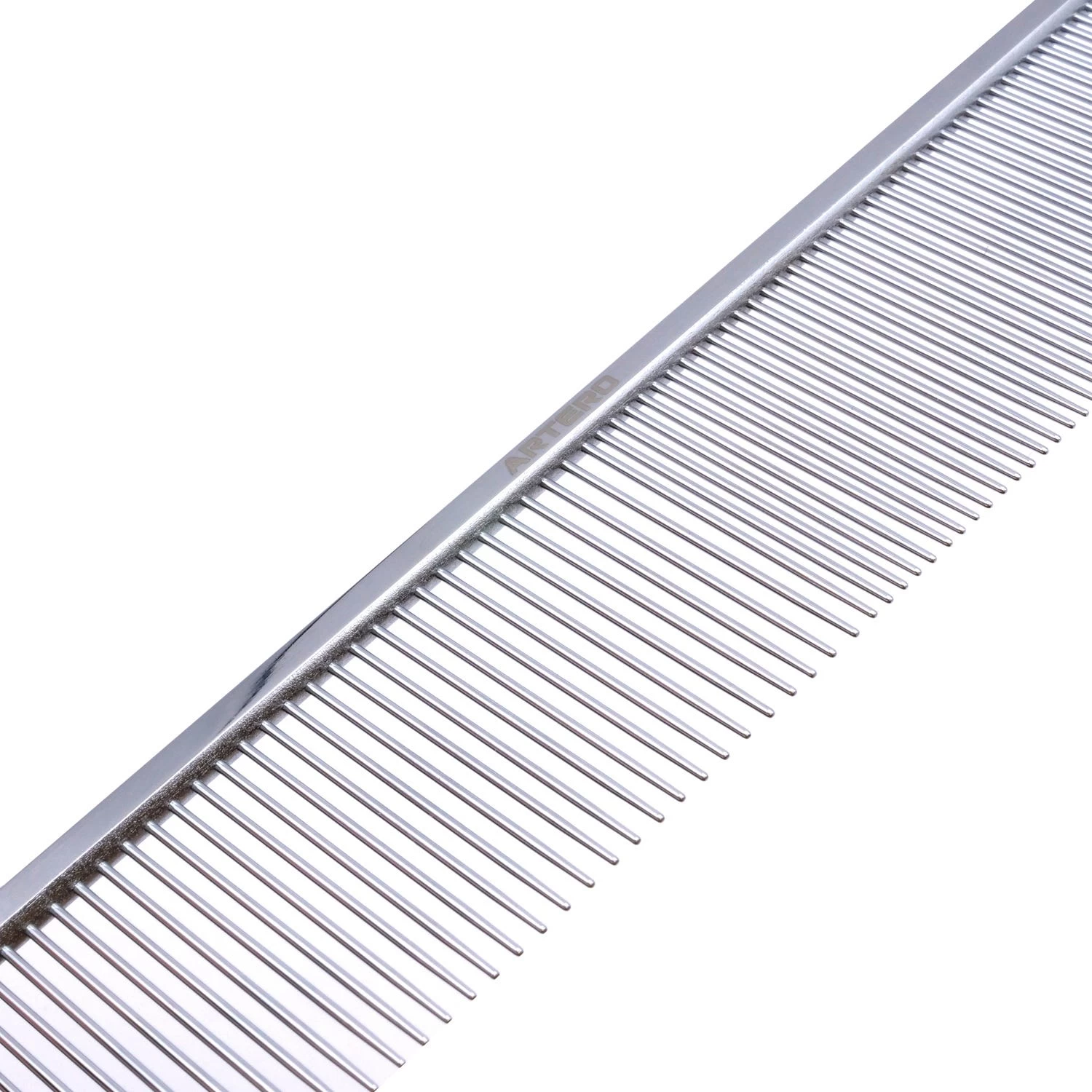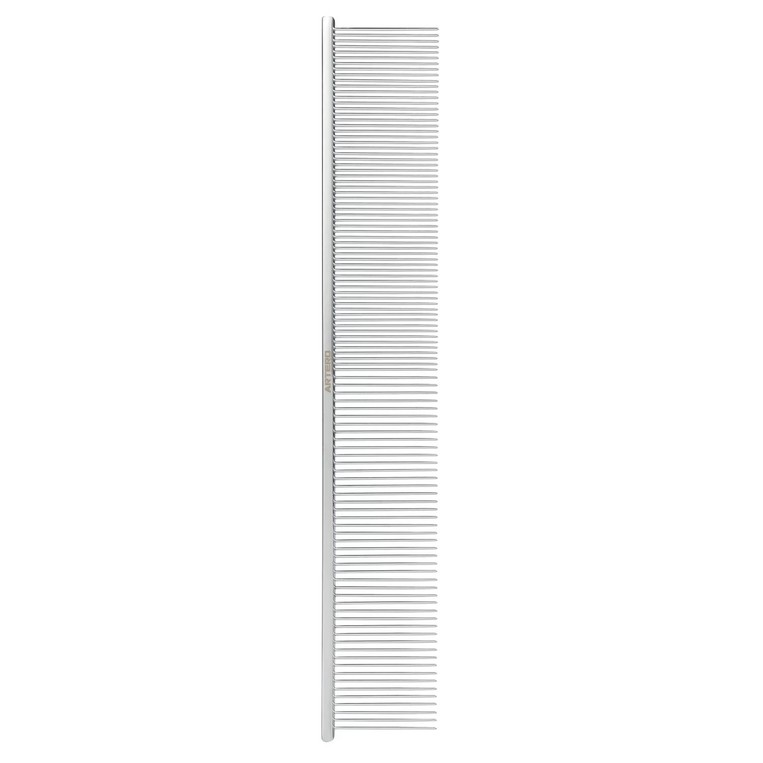 Artero® Nature Collection Extra Volume Comb is ideal for combing dogs of all sizes with medium coat densities. Metal combs with chrome coating on the teeth to prevent them from rusting. Smoothly glides through hair. Reaches to the root and opens the coat evenly providing greater volume. Ideal for styling during cutting, exhibition or competition. Not intended for detangling. It has a wider and a narrower teeth spacing for coarse or detail work. 9″