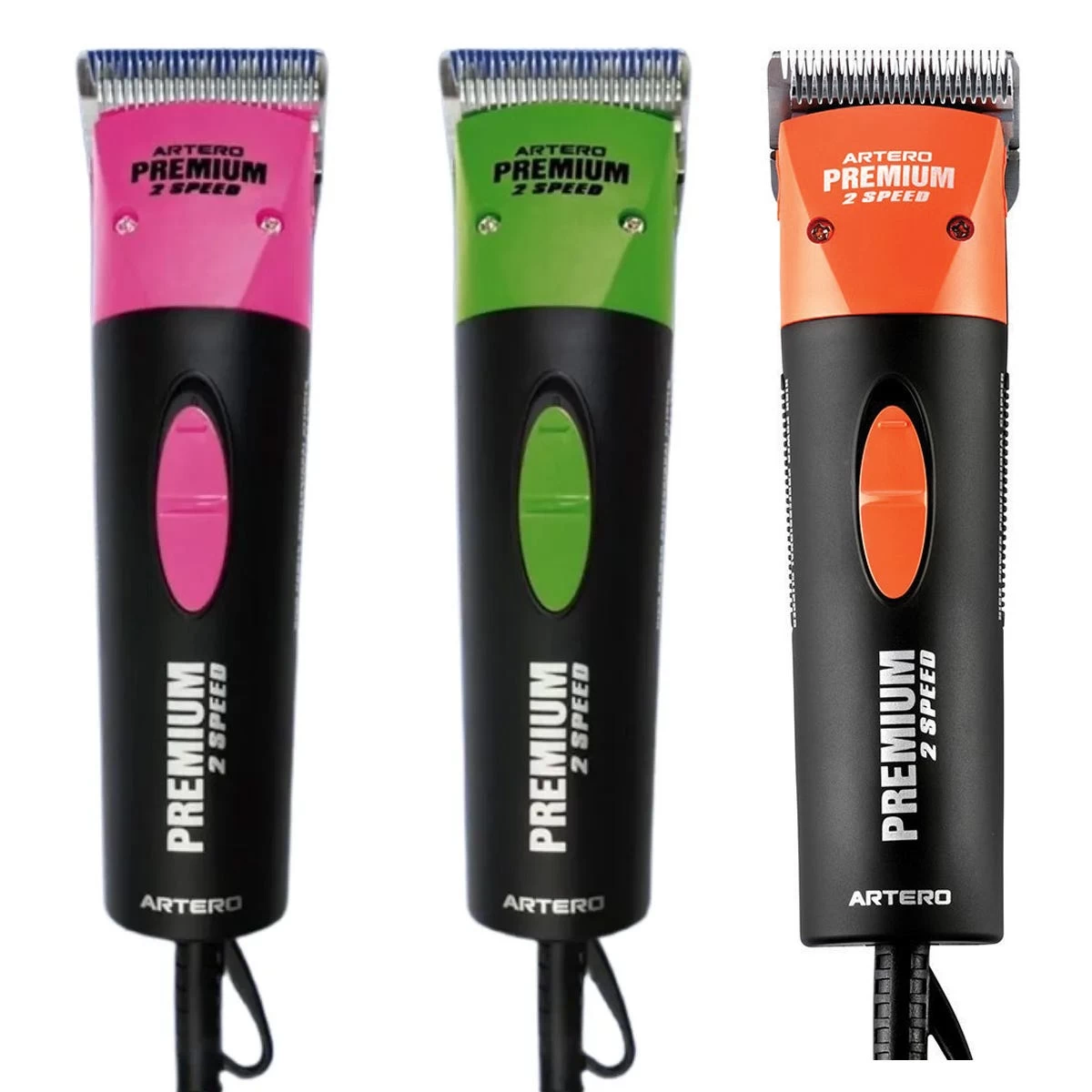 The Artero Premium 2-Speed Professional Grooming Clipper is a lightweight, powerful 2-speed clipper. Two-speed clippers have a cool and quiet operation and blades do not overheat as much as single speed clippers. Use normal speed for most cutting needs and faster speed for dogs with heavy coats. With the transformer at the plug end of the cord, this clipper is lightweight resulting in minimal hand and arm fatigue, allowing you to groom longer. Corded power means consistent power with no batteries to worry about. Admired and coveted by European groomers for their dependability, Artero clippers are a premium clipper at a great price. Clipper is A5 blade compatible with Master Grooming, Sensei, Andis, Wahl, and Oster blades, making it convenient and easy to switch to this reliable clipper. With the clipper comes 8 snap on combs, a #10 blade, oil, and a cleaning brush in a hard case to protect your clipper when traveling or storing in the salon. Comb attachments include a 3mm, 6mm, 9mm, 12mm, 15mm, & 18mm making this a versatile clipper.