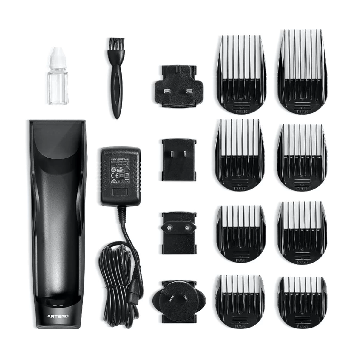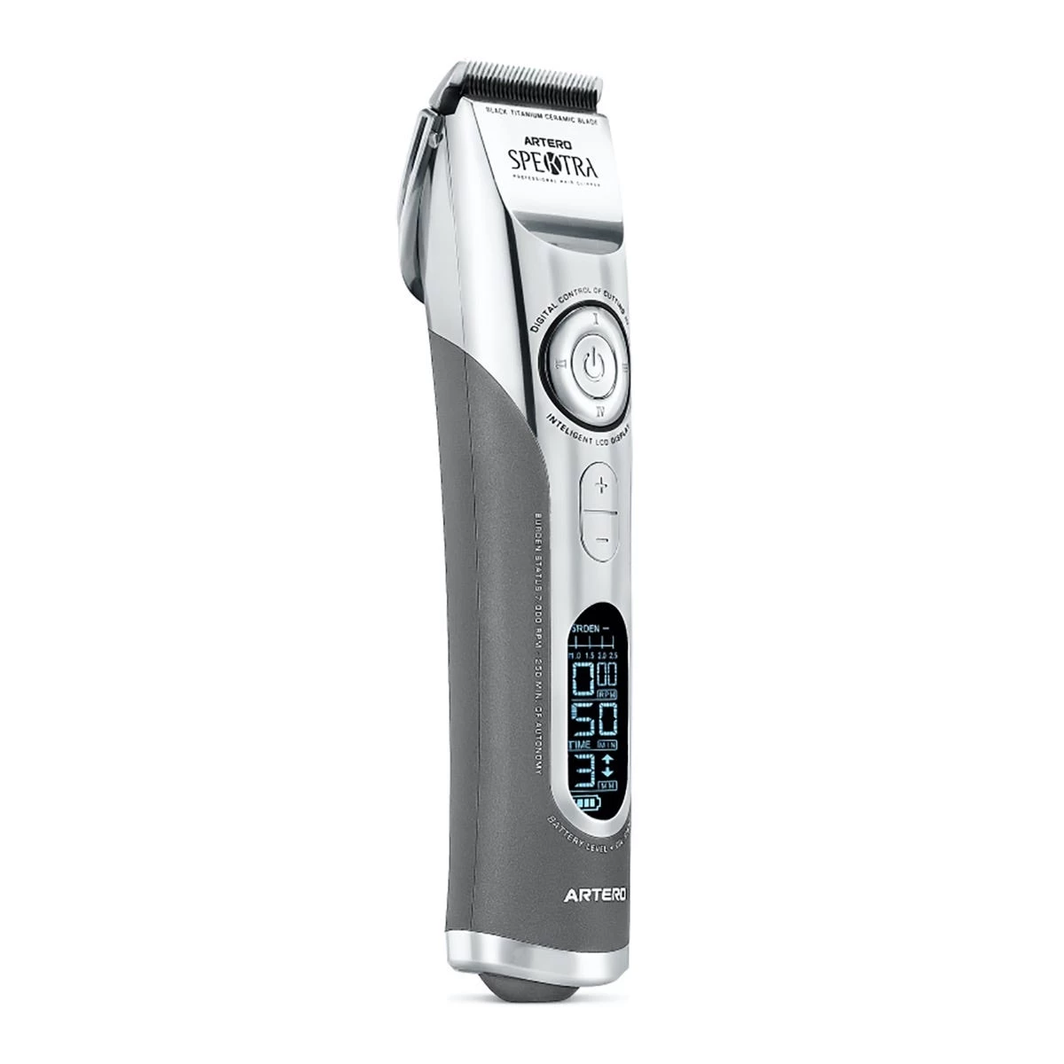 Artero® Spektra 5-speed Cordless Clipper features easy-to-read digital interface and 5-speed control for the ultimate ease of use. 4-in-1 sleek black ceramic blade, digitally adjusted cutting length control. Facilitates smooth fades. Use corded for all day trimming or cordless to reach tough spots with ease. Speed ranges between 5,000 to 7,000 rpm for versatile clipping. 4-hour Lithium-Ion battery life for extended grooming. Includes 4 guard comb attachments, lubricating oil, 4 in 1 blade, charging base, cleaning brush, battery, and electrical plug with adapter for all countries.