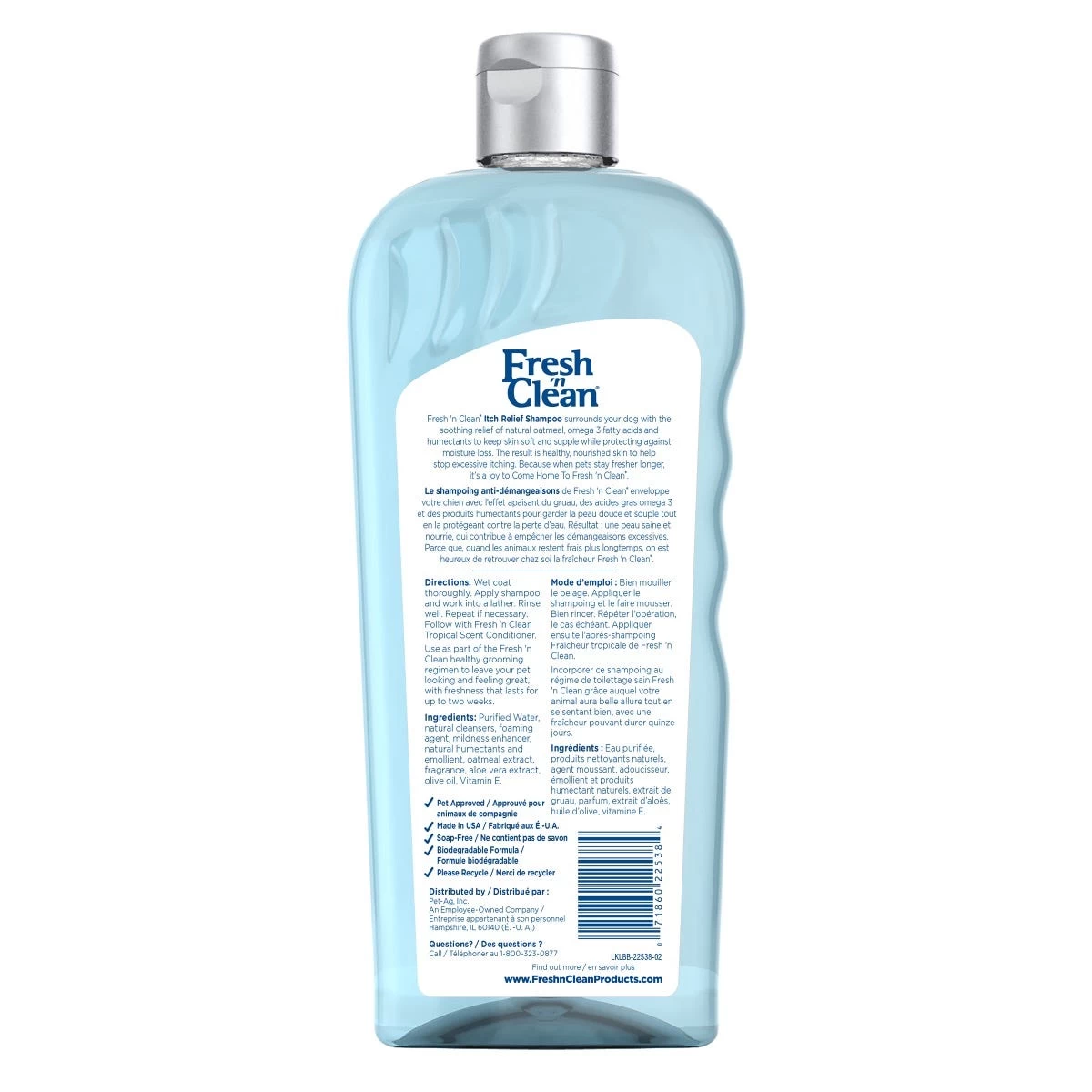 Fresh ’n Clean® Itch Relief Shampoo surrounds pets with the soothing relief of natural oatmeal, omega 3 fatty acids and humectants to keep skin soft and supple while protecting against moisture loss. The result is healthy, nourished skin to help stop excessive itching. Wonderful Rain Shower Fresh Scent. 18 oz