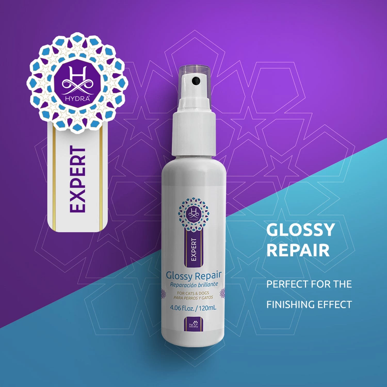 Directions: Topical use. Apply and spread a few drops of Hydra Expert Glossy Repair in the palm of the hand and massage along the dry or wet coat.Â