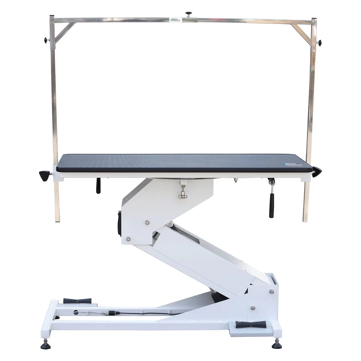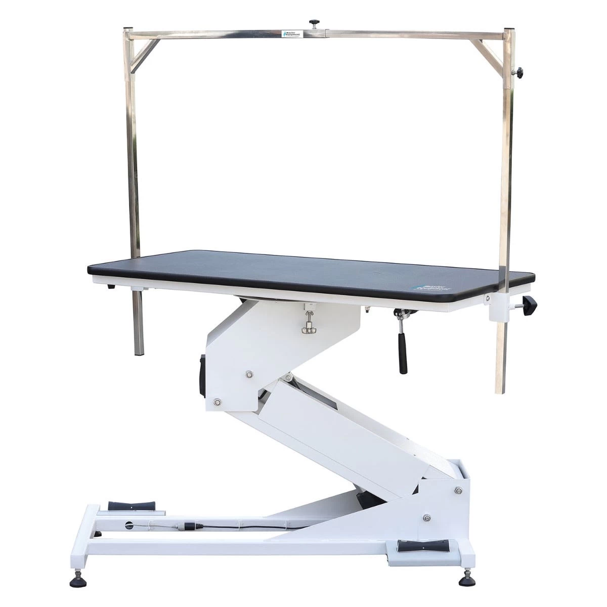 Master EquipmentĀ® Electric Z-Lift Rotating Tables combines all the features of the Master Equipment Z-Lift series with the added convenience of a tabletop that rotates 360 degrees. Rotating top allows the pet to be turned around effortlessly, making it easier for the groomer to access different areas of the pet’s body. This function can be particularly useful when grooming a pet that is not used to being groomed or is anxious. Rotating tabletop allows the groomer to remain stationary, eliminating unnecessary steps of walking around the table! You’ll wonder how you lived without it. Features easy release clamps that stop tabletop at any point in rotation, water proof UL power sockets & USB ports, convenient double foot pedal controls, strong table top board with quality rubber top, and includes both single arm and overhead arm with 2 nylon loops! Height adjust from 21.2″ to 44″ and loading capacity is 280 lbs, making this a workhorse of a table too.