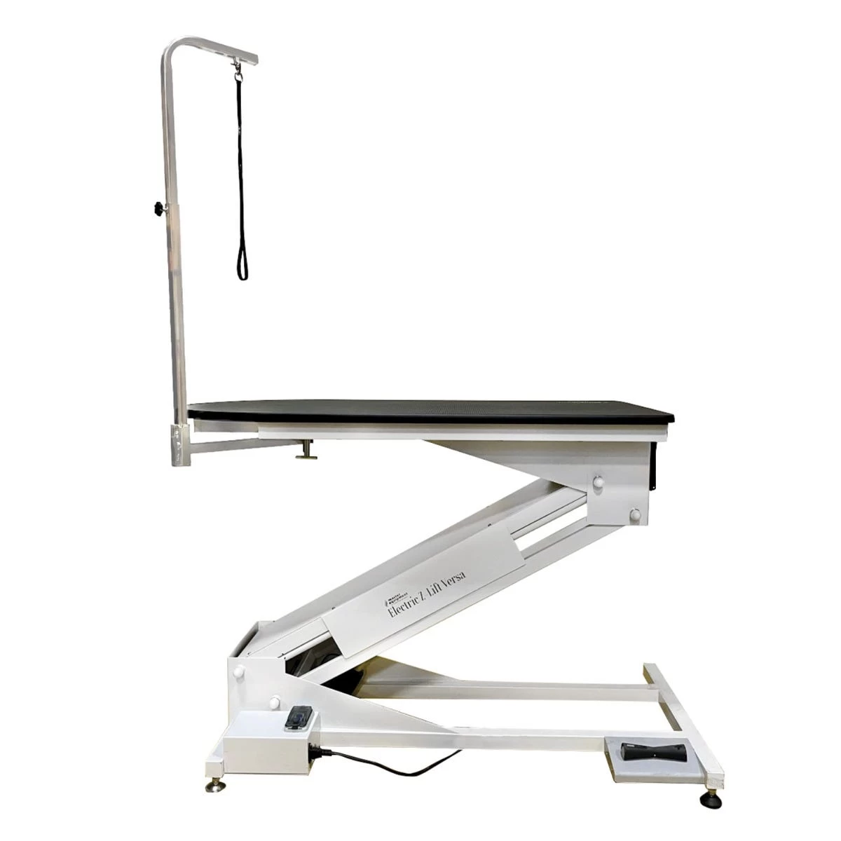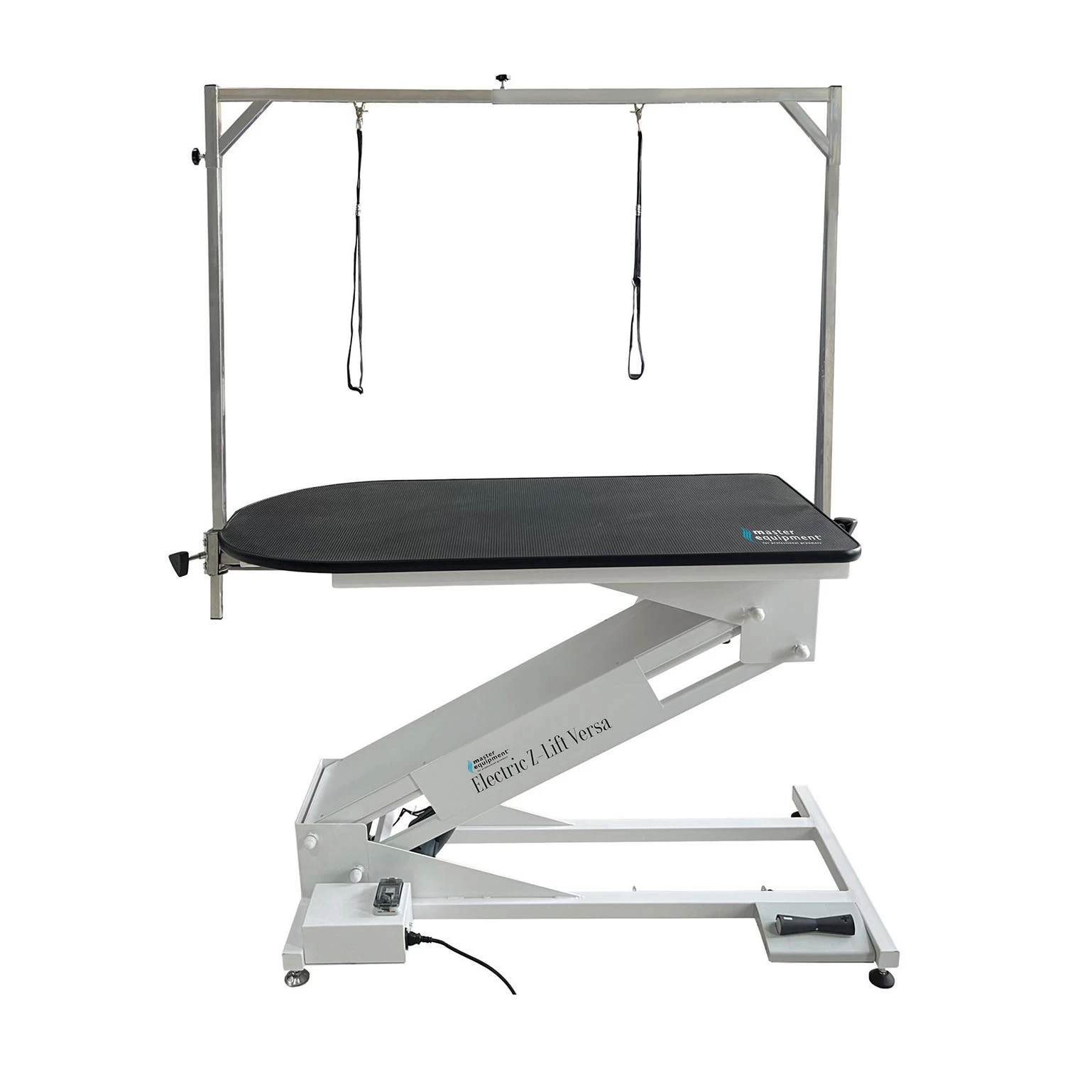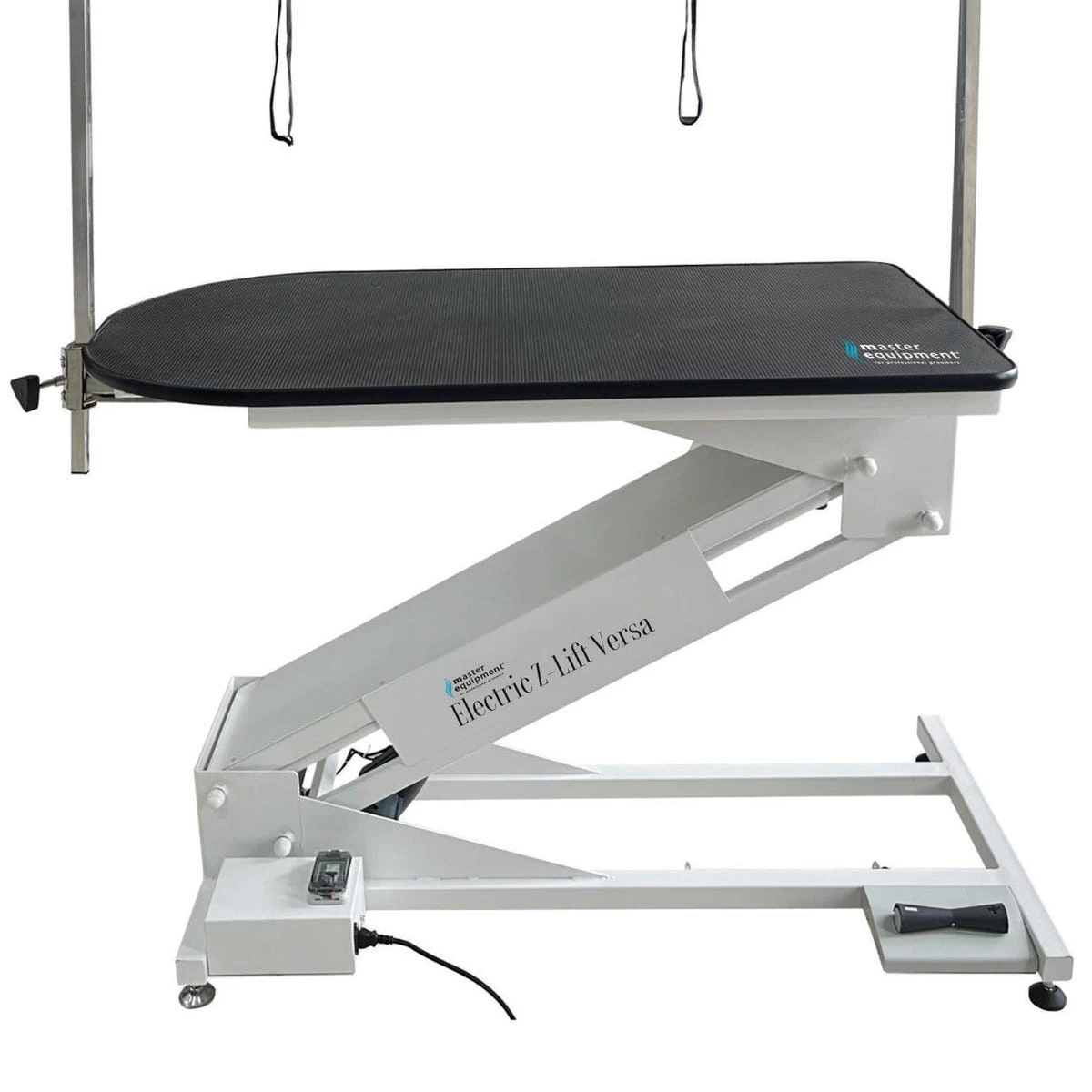 Overhead Arm Master Equipment Electric Z-Lift Versa Dog Grooming Table is a professional-duty versatile table designed for the professional groomer. Powerful lift capacity of 350 lbs means this table can handle even the largest dogs! Table top is 47”L x 23.5”W and is 1” thick. Table height is adjustable from 14.17″ to 42.5″ eliminating the need to pick up large dogs and is also great for small dogs too. With a versatile swivel arm that allows you to position the grooming arm out of the way when needed, table also has brackets for the included overhead grooming arm. The overhead arm allows you to use two grooming loops for more control over a hyperactive or uncooperative dog. It’s great for groomers who work by themselves and don’t have an extra set of hands around. Two USB outlets for charging and two electrical outlets for corded clippers and dryers keep the floors clear and safe around the table. Foot pedal control to raise and lower the table.