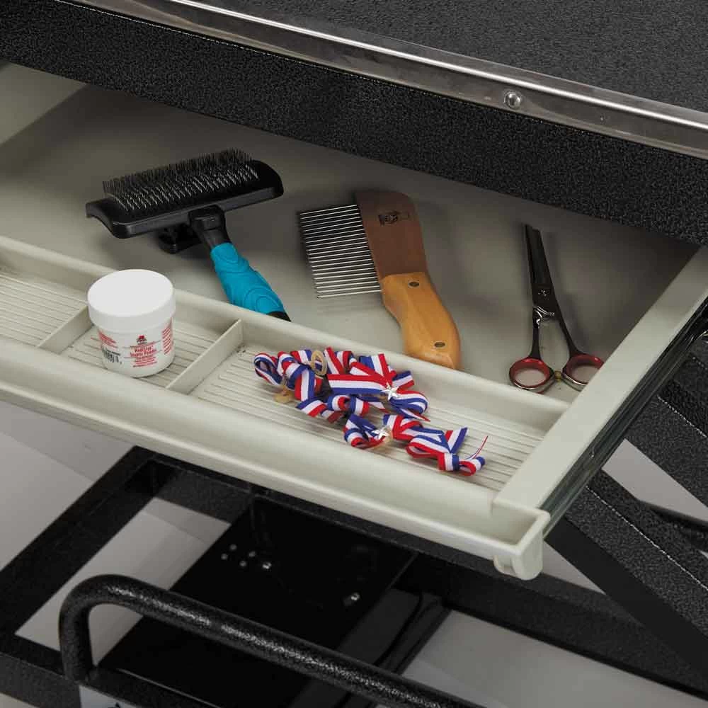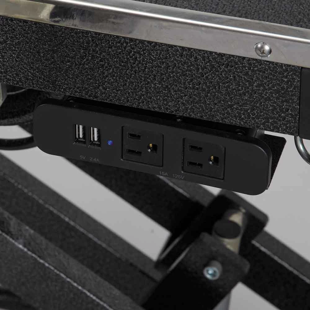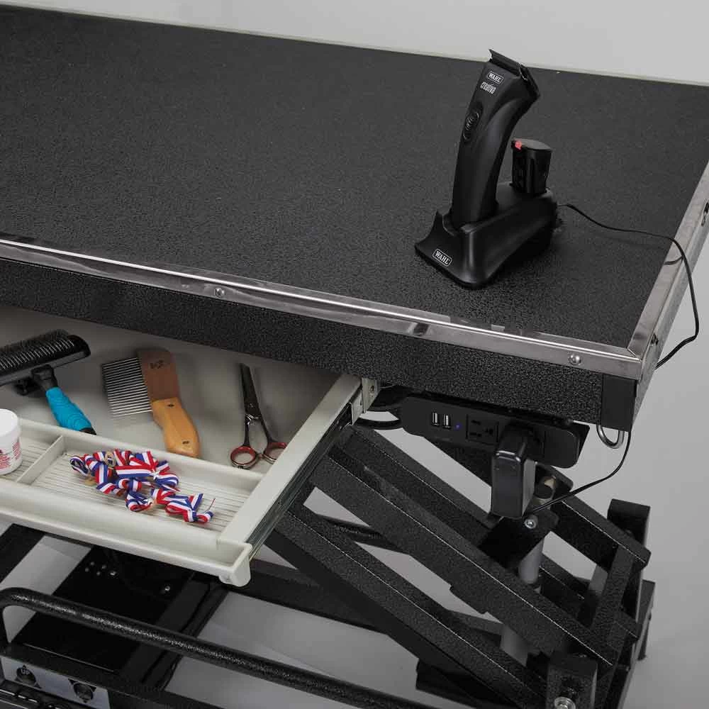 The Master Equipmentâ„¢ Origin II Electric Table is now more functional than ever! Features 2 grounded electrical outlets, two USB ports, sturdy iron and wood construction, and a drawer for added convenience. Master Equipment has upgraded their classic design adding value and functionality to what was already regarded as one of the best grooming tables available. Outlets on the table mean fewer cords running across the floors, and the convenient drawer means misplaced grooming tools are a thing of the past!