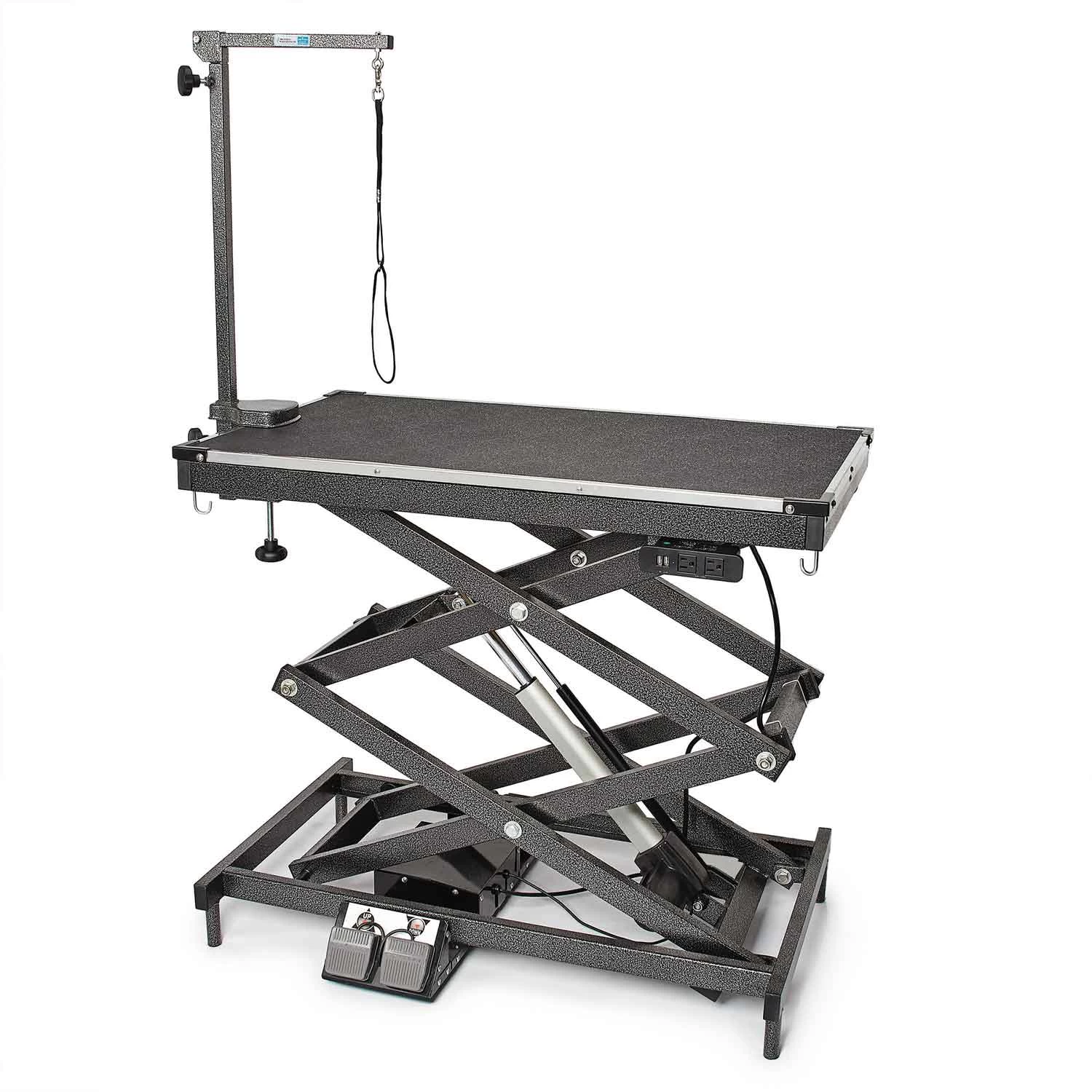 Master Equipment® X-Tend Delux Electric Grooming Table is a professional-duty versatile table designed for the professional groomer. Powerful lift capacity of 220 lbs means this table can handle the big dogs! Table height is adjustable from 11″  (without Grooming arm attached,  21″ with Arm attached) to 48.5″ eliminating the need to pick up large dogs and the max height means you can groom the little dogs at a comfortable height. Two USB outlets for charging or USB tools and two electrical outlets for corded clippers and dryers keep the floors clear and safe around the table. Convenient hooks for hanging tools so you can keep your table top clear. Levelers on all four legs keep table steady on uneven floors. Convenient dual foot pedal control to raise and lower the table. 41″ x 24″ top. Includes Grooming arm with clamp and Grooming loop.