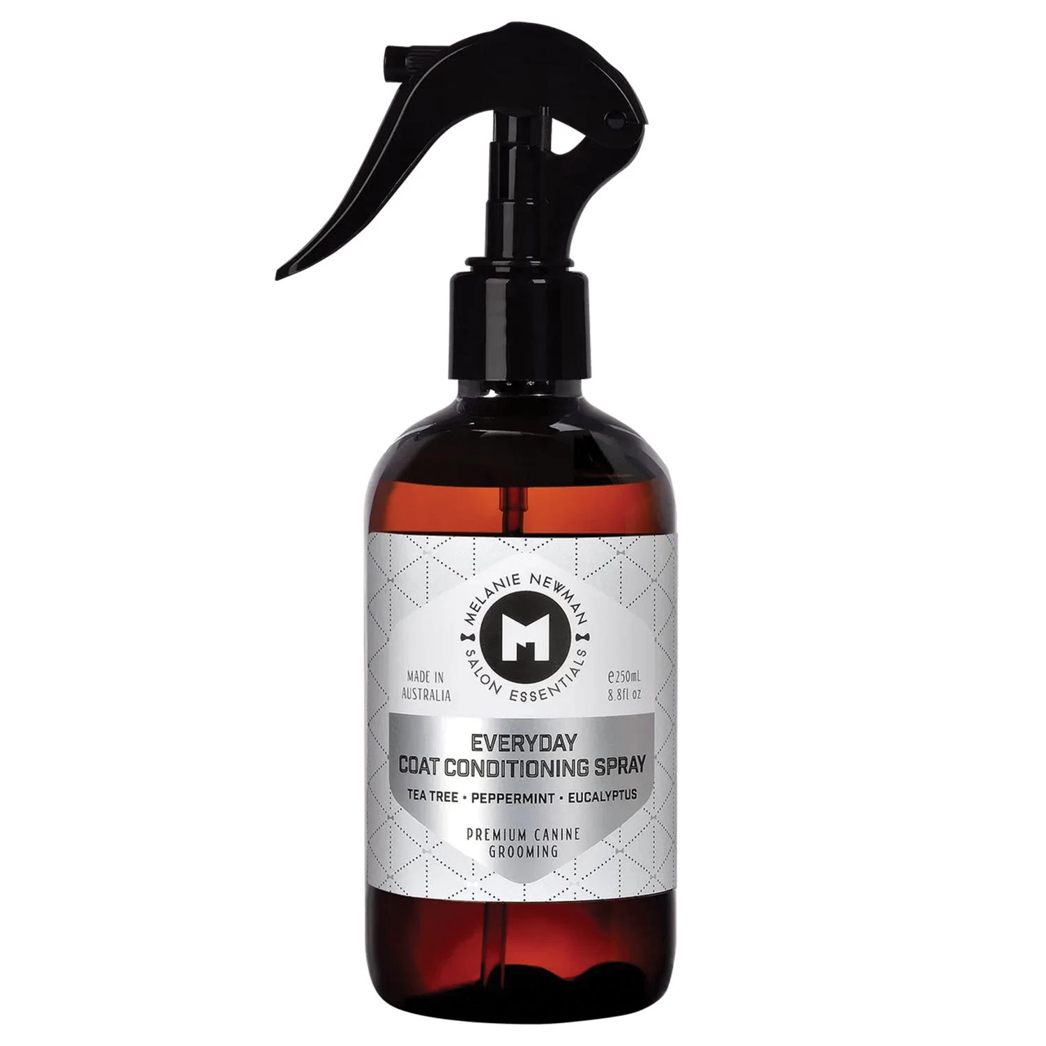 Melanie Newman® Salon Essentials Everyday Conditioning and Detangling Spray is designed to return condition to the coat, leaving the coat silky. Using therapeutic grade essential oils to hydrate and strengthen while smoothing out the cuticle and eliminating frizz and fly away coat. Free from harsh synthetic chemicals, contains vitamin enriched moisturizing oils and organic essential oils of Tea Tree, Peppermint and Eucalyptus, providing naturally scented, tangle-free, healthy coat with a natural shine. It can be used with a wet or dry coat and in between brushing during the bathing process. Provides thermal protection while using hair dryers that may be used while styling dog’s coat. 8.8 oz