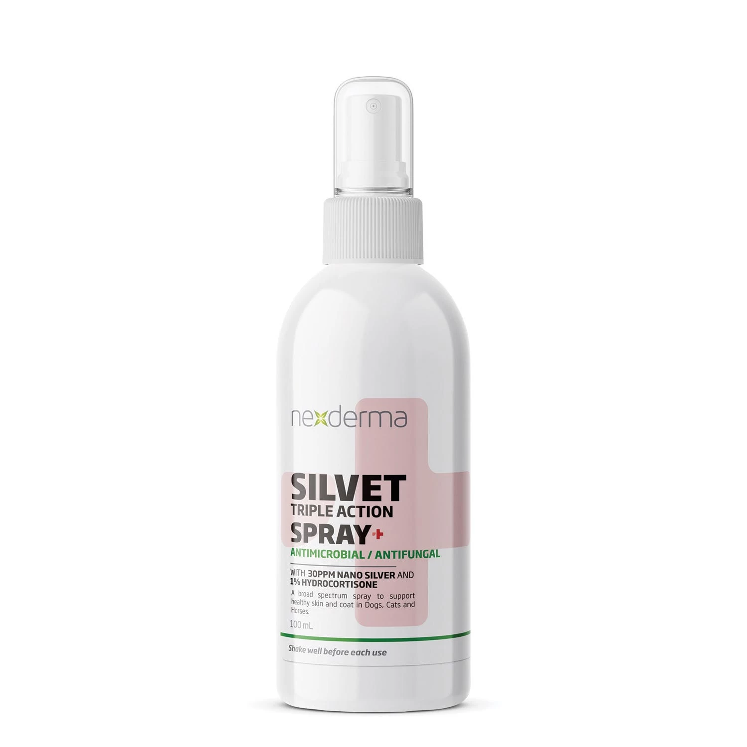 NEXDerm® Silvet Hydrocortisone Spray is a antifungal, antimicrobial, anti-inflammatory in an easy to use spay formula. Contains 30ppm Colloidal Nano Particles of Silver suspended in a proprietary formula and includes hydrocortisone. Silver supports healthy skin and coats, the addition of hydrocortisone enhances the reduction of pain, itching and swelling. No stinging or discoloration to skin or fabrics. Can be used as a cleanser and is great for ulcerated wounds. A consistent measure of 30 ppm nanosilver is administered with each application. Has been shown to aid in treatment of skin irritations, wounds, fungus, hot spots, burns, abscesses, sores, thrush, rain rot, and more. 100% natural containing NO chemicals like hypochlorous acid, NO antibiotics, and NO steroids.